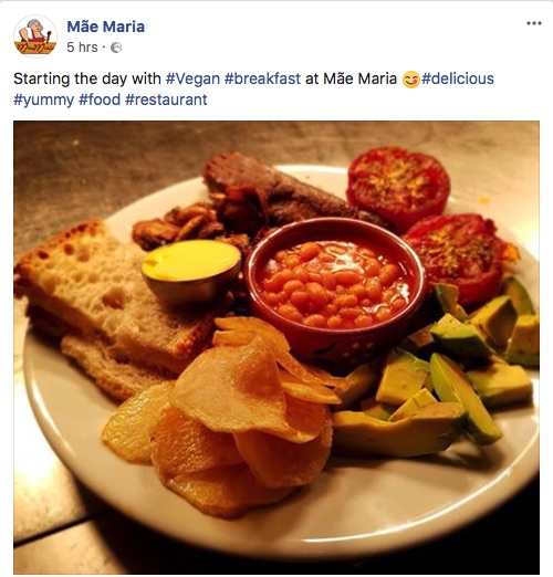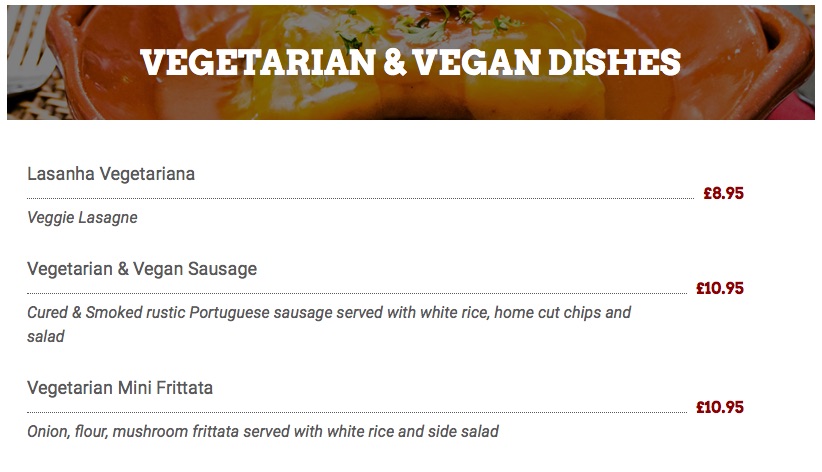 Comments: There are loads of labelled vegan options at this Portuguese restaurant & taverna. These include vegan sausage (cured & smoked rustic Portuguese sausage served with white rice, home cut chips & salad), tapas dishes, a yummy breakfast and cake. It is also really kid friendly with lots of toys.