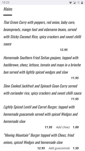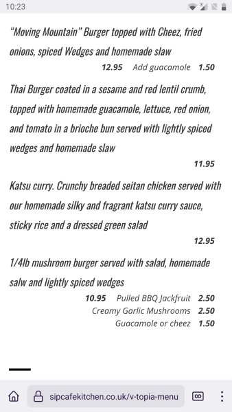 Comments: They have a moving mountain 100% plant burger on the menu which comes with an option of vegan cheese but you would need to check that everything it comes with is also vegan. They also have a couple of other dishes that may be vegan and stock oat or almond milk for drinks.
