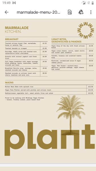 Comments: They have a vegan menu, please see the attached photo. They also have vegan cakes, scones and soya, almond & oat milk for drinks.