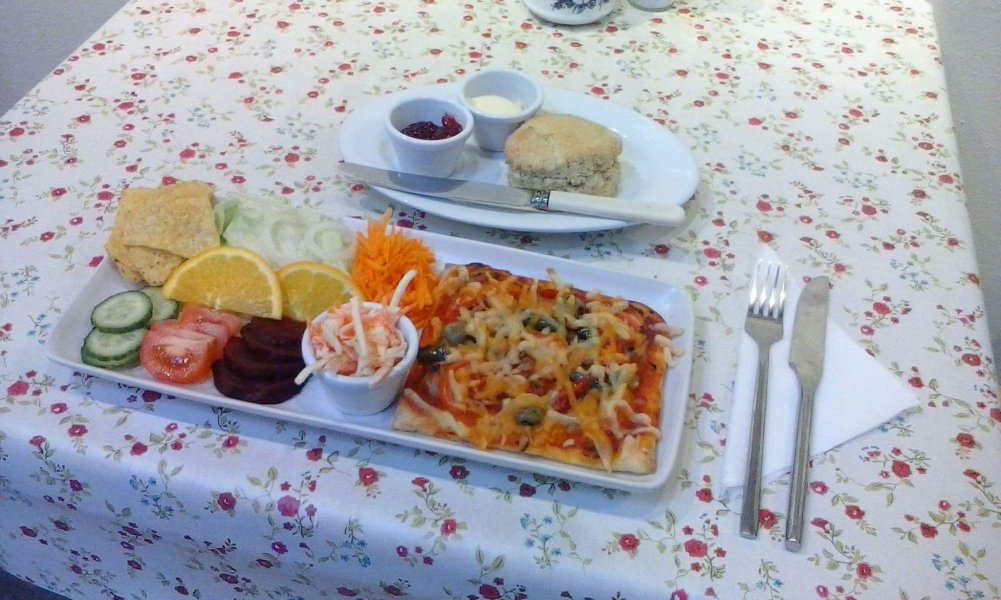 Comments: There are many suitable options, one vegan dish for every meat dish on the menu. The homemade vegan food includes items such as shepherd's pie, burger, sausage, mash & beans, soups, pizza (pictured), jacket potatoes and sandwiches or toasties. There are also delicious sweet choices such as chocolate & caramel cake, carrot cake, flapjacks and nutty caramel crispy squares. They always have soya milk for drinks. You do not have to pay to go into the park to visit the café.