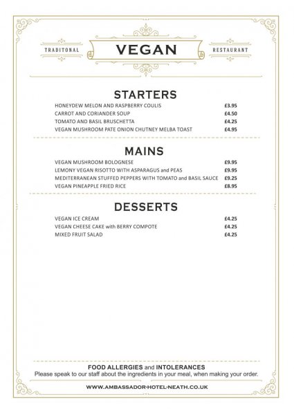 Check with the staff what is suitable on the other menus but they do offer mains of baked aubergine or pepper stuffed with ratatouille & topped with vegan cheese and wild mushroom nut roast with vegan gravy and the starter/main of beetroot & vegan cheese salad.