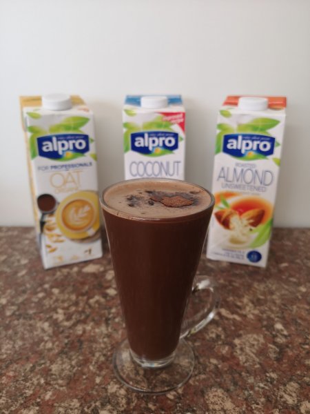 Labelled VeganComments: Dog-friendly. Hot drinks including hot chocolate, with a variety of vegan milks including oat, almond, macadamia, coconut. All at no extra charge.