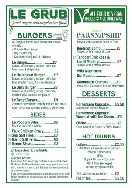 Comments: This is a great pub for vegans; almost all the menu is vegan except for one vegetarian dish. The vegan main options are chipotle bean, soy 'beef' or Southern fried jackfruit 'chicken' burgers and three dishes supplied by The Parsnipship served with couscous salad or fries; beetroot bomb, tandoori chickpea & lentil mashup and wild mushroom nut roast. All the sides and desserts are vegan. The sides are crispy jackfruit nuggets, faux chicken gravy, sea salt or garlic salt fries and house slaw. The desserts are homemade cupcakes, warmed cupcakes with ice cream and Oreo, Biscoff or Raspberry Ruffle shakes. Soya, almond, coconut & oat milks are available for coffees and teas.
