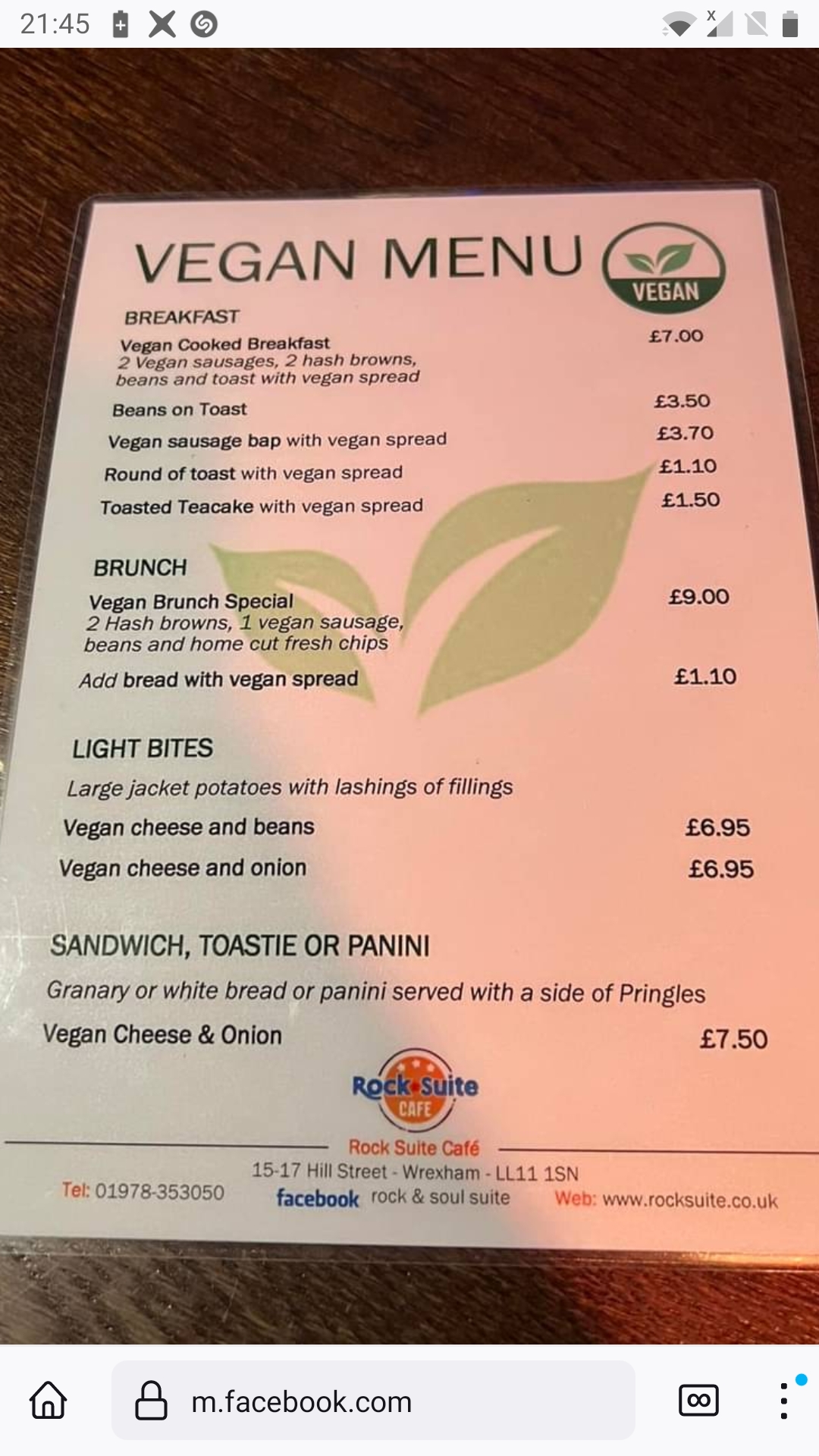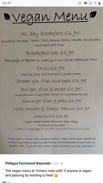 Comments: There are plenty of options for vegans here. These include large or small breakfasts (including sausages & scrambled tofu), jacket potatoes with vegan cheese, tofu in basil or jackfruit, chickpea flour vegan pizza (with cheese), toasties & panini with vegan cheese, burger, chilli burger, lunch boxes and cake.
