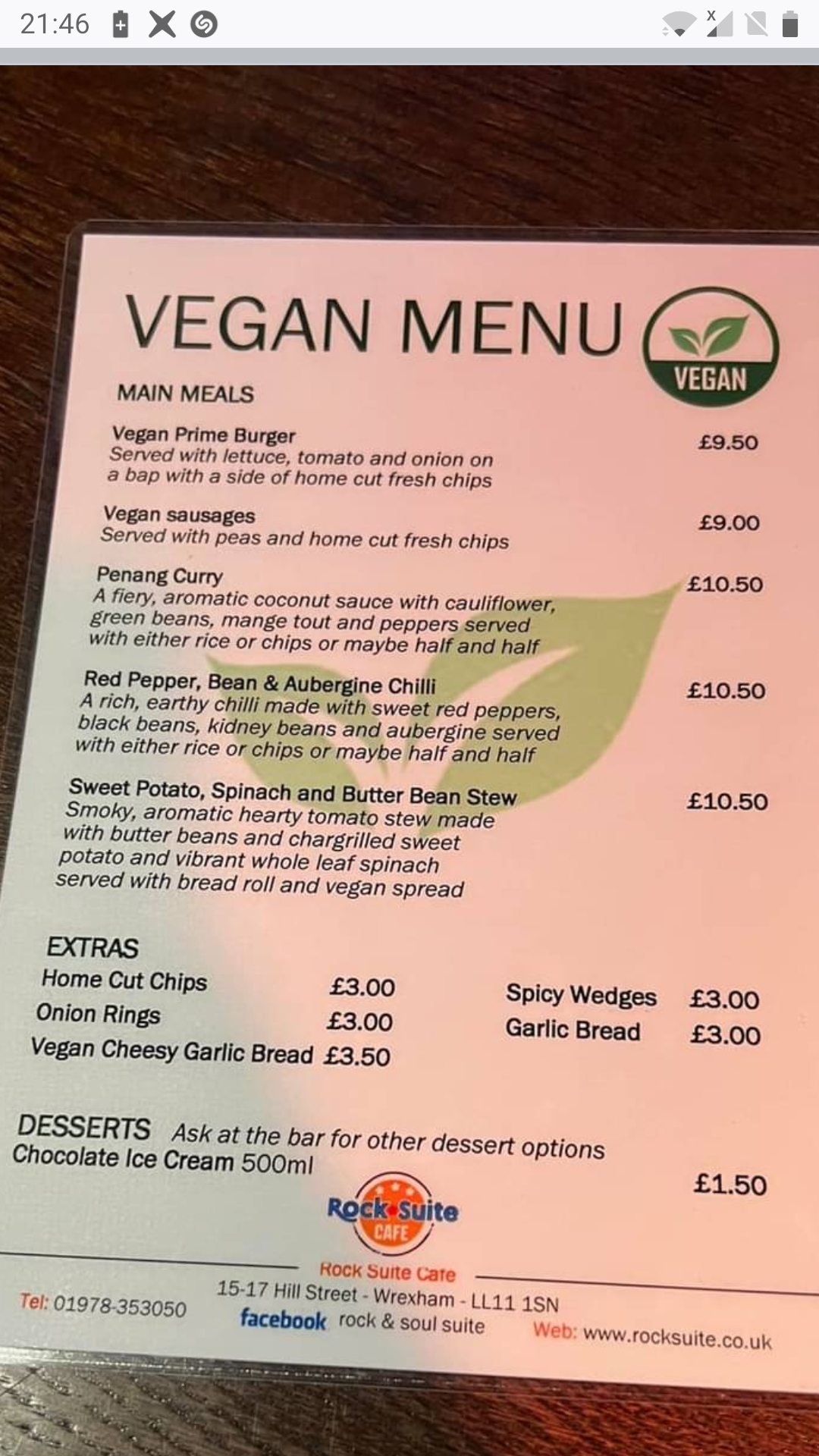 Comments: There is a separate vegan menu with options of classic veggie burger, bologna burger, vegan pasta bolognese, sunshine cous cous & red pepper salad, whole mushroom bourguignon pie, Morrocan spiced aubergine stew, vegetable jalfrezi and battered tofu & chips.