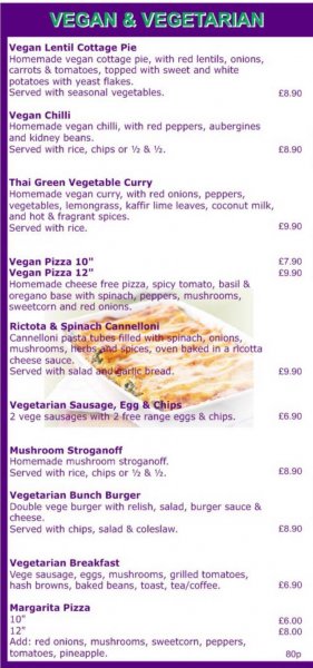 Comments: The labelled vegan options available are: Vegan lentil cottage pie (homemade, with red lentils, onions, carrots & tomatoes, topped with sweet and white potatoes with yeast flakes, served with seasonal vegetables), vegan chilli (homemade, with red peppers, aubergines & kidney beans, served with rice, chips or ½ & ½), Thai green vegetable curry (homemade, with red onions, peppers, vegetables, lemongrass, kaffir lime leaves, coconut milk and hot & fragrant spices, served with rice) and vegan pizza (10” or 12” homemade cheese free pizza, spicy basil & oregano base with spinach, peppers, mushrooms, sweetcorn & red onions). They also have daily vegan specials.