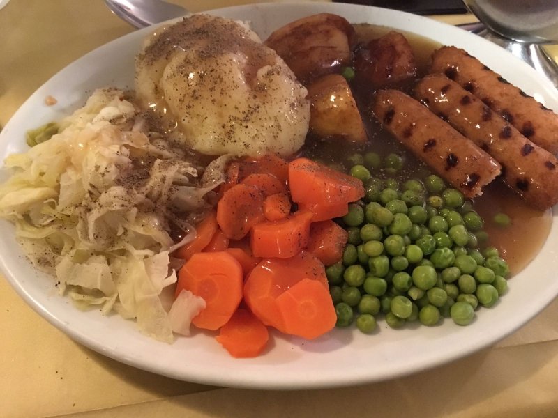Comments: Vegans can be catered for, with advance notice. They can offer Linda McCartney sausages with mashed potatoes, vegetables, gravy etc. (pictured), curry or chilli. Child portions can be provided. They can also do starters of potato wedges or curly fries, with salad.
