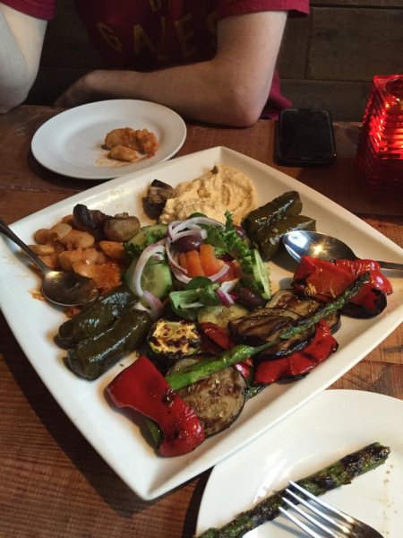Comments: Mythos label their vegan options. These are the meze dishes of olives & homemade bread, houmous, Greek salad, dolmades and gigantes and the mains of lahanika (tower of marinated & grilled aubergines, courgettes, peppers & asparagus, drizzled with balsamic vinegar) and briam (vegetables, slow cooked in a tomato sauce). The staff are helpful.