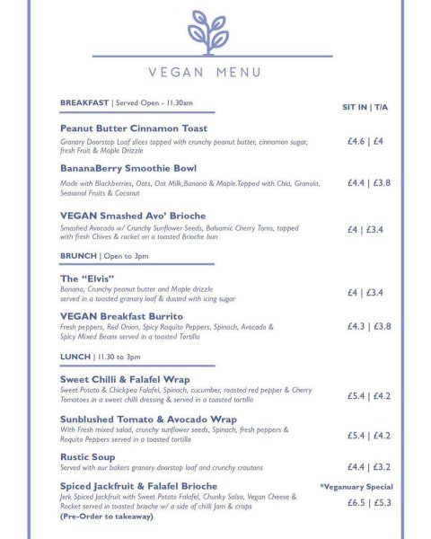 Comments: They have a dedicated vegan menu. The breakfast options are served until 11.30am and are peanut butter cinnamon toast, banana berry smoothie bowl and smashed avo' brioche. Brunch dishes are served until 3pm; breakfast burrito and the “Elvis” (banana, peanut butter & maple drizzle served in a toasted granary loaf & dusted with icing sugar). Lunches are served from 11.30am to 3pm, Monday to Saturday; sweet chilli & falafel wrap, sun blushed tomato & avocado wrap and rustic soup. There are also vegan cakes and dairy free milks for coffees etc.