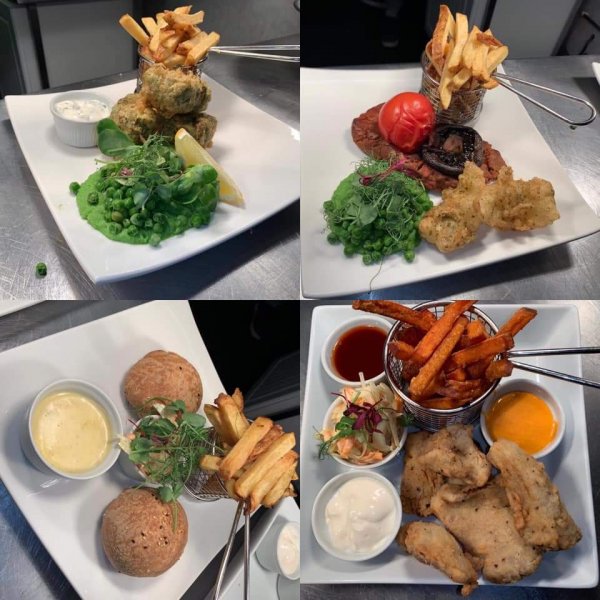 Comments: The Village Inn has a full vegan menu of excellent food. The starters are soup, faux gras (mushroom & cognac pate), cauliflower 'buffalo wings' and golden crispy fried cashew nut Brie. The mains consist of stuffed 'cheeseburger' dough ball sliders, oyster mushroom 'fried chicken', tofu 'fish & chips', seitan 'steak' & chips and king oyster mushroom Chinese style sticky 'ribs'. The desserts include options such as chocolate tart. The veggie option for Sunday roast dinner is vegan by default and includes great cauliflower ch**se. The staff seem informed, the service is good and the décor & ambience are great.