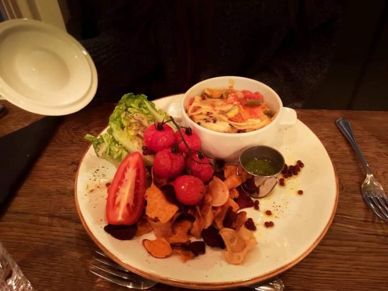 Comments: The pub at the Royal George Hotel has labelled vegan dishes; root vegetable tempura starter and mains of vegetable lasagne and Buddha bowl. At the time our researcher visited there was also a suitable lemon cheesecake dessert. It has a really cosy gastropub feel, service is great and it is dog friendly.